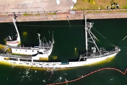 Navio científico com 60 anos de história tomba e fica submerso em Santos
