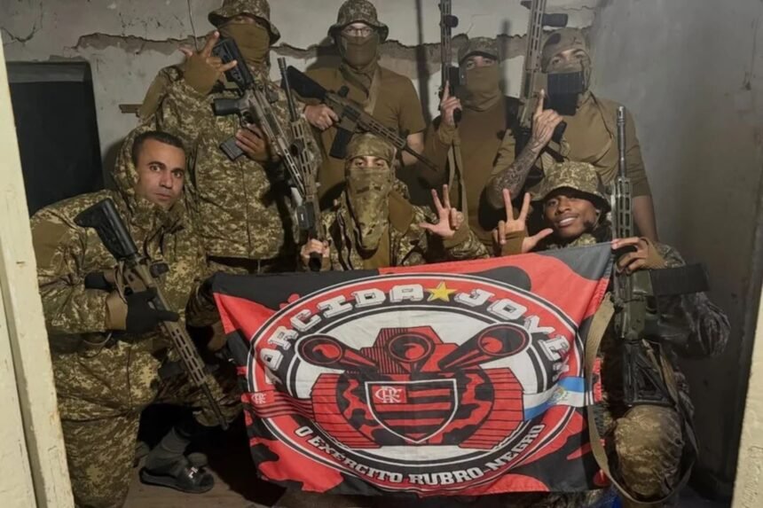 No último sábado (4), uma foto começou a circular nas redes sociais mostrando um grupo de brasileiros na Ucrânia exibindo a bandeira da Torcida Jovem do Flamengo.