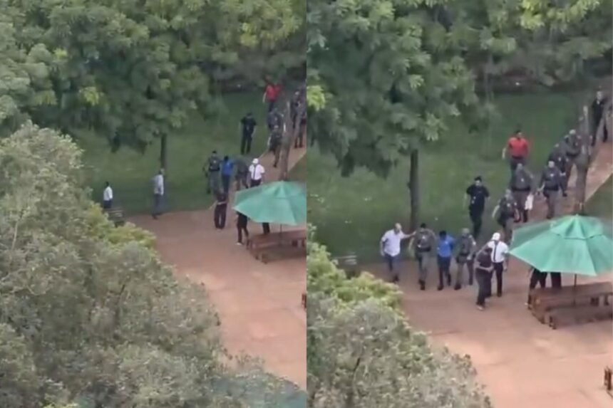 Em determinado momento, um dos suspeitos, que estava desarmado, se afastou do grupo e invadiu a instituição de elite durante o horário das aulas. Imagens mostram crianças no pátio e nas quadras de futebol no momento em que ele entrou na escola.