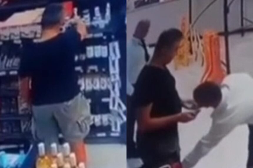 Na sequência, ele segue até o caixa e paga por outros produtos, deixando o estabelecimento com duas sacolas. Pouco depois, um segurança o acompanha de volta ao interior da loja. Já no retorno, ele retira o vidro do bolso e o entrega ao vigilante, que realiza uma revista no servidor.