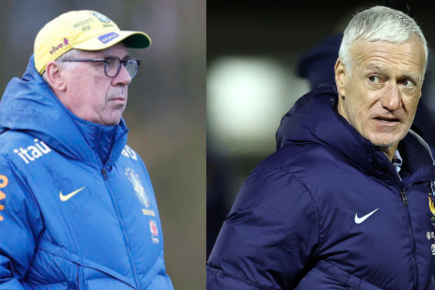 Carlo Ancelotti, técnico do Brasil, Didier Deschamps, técnico da França • @rafaelribeirorio/CBF e FRANCK FIFE/AFP