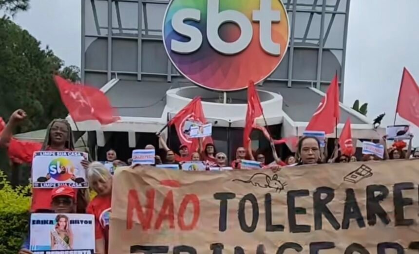 Manifestantes do MTST protestaram nesta sexta-feira (13) em frente à sede do SBT, em Osasco, contra comentários do apresentador Ratinho sobre a deputada federal Erika Hilton, considerados transfóbicos. Durante a ação, o grupo chamou o comunicador de “seu fascistinha” e tentou invadir o prédio, mas foi impedido por seguranças.