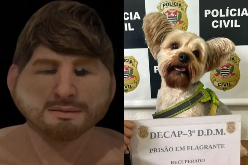 A máscara realista, que imitava o rosto de outra pessoa, e o cão foram localizados no apartamento do suspeito. O animal foi encontrado sem ferimentos e devolvido à vítima.