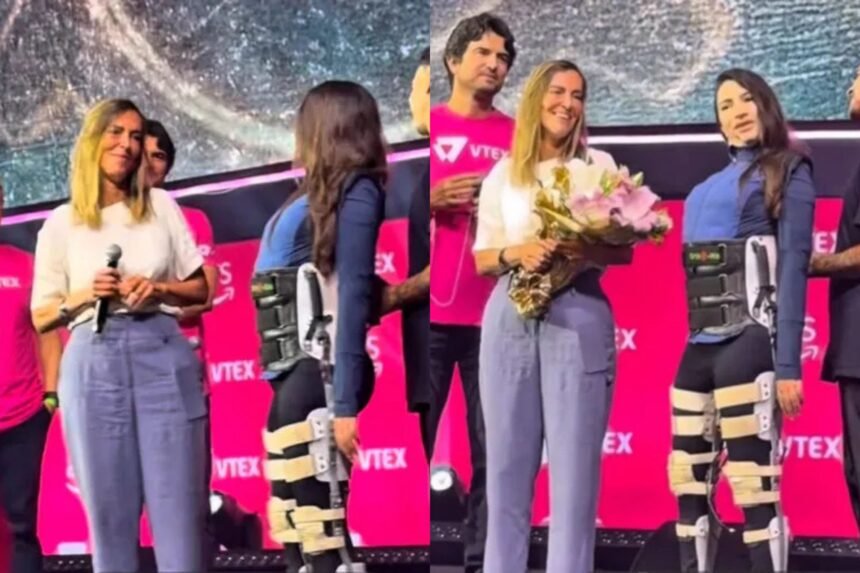 A ex-atleta subiu ao palco do Brazilian Engineering Awards pela primeira vez de pé em público, ainda com auxílio, para entregar o prêmio à médica.