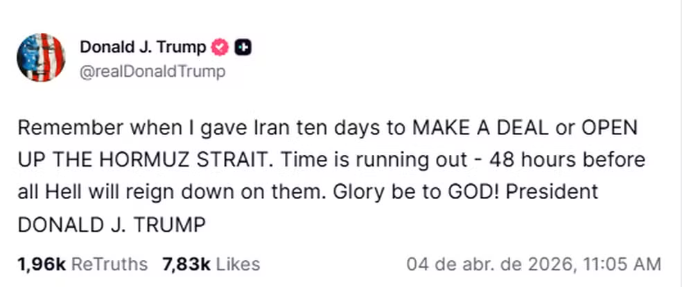 O presidente dos Estados Unidos, Donald Trump, deu um ultimato de 48 horas ao Irã para que o país reabra o Estreito de Ormuz, uma das principais rotas marítimas para o transporte global de petróleo. A declaração foi feita neste sábado (4), em meio à escalada do conflito no Oriente Médio, e inclui uma ameaça direta de consequências severas caso o prazo não seja cumprido. Em mensagem divulgada publicamente, Trump afirmou que “o tempo está se esgotando” e indicou que a situação pode se agravar rapidamente se não houver um acordo.
